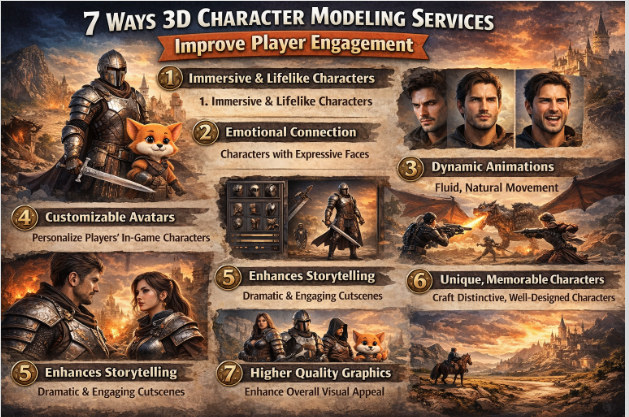 Most developers are currently partnering with a 3D game art outsourcing house in order to come up with characters that are visually appealing and will appeal to players on all platforms. Now, we will look at 7 major enhancements by 3D character modeling services with regard to engaging players.